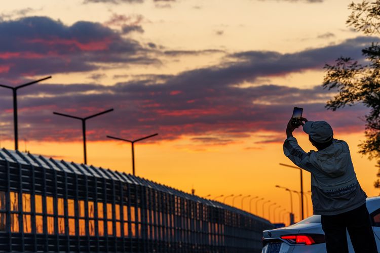 人们用手机拍摄夕阳中的祈年殿。