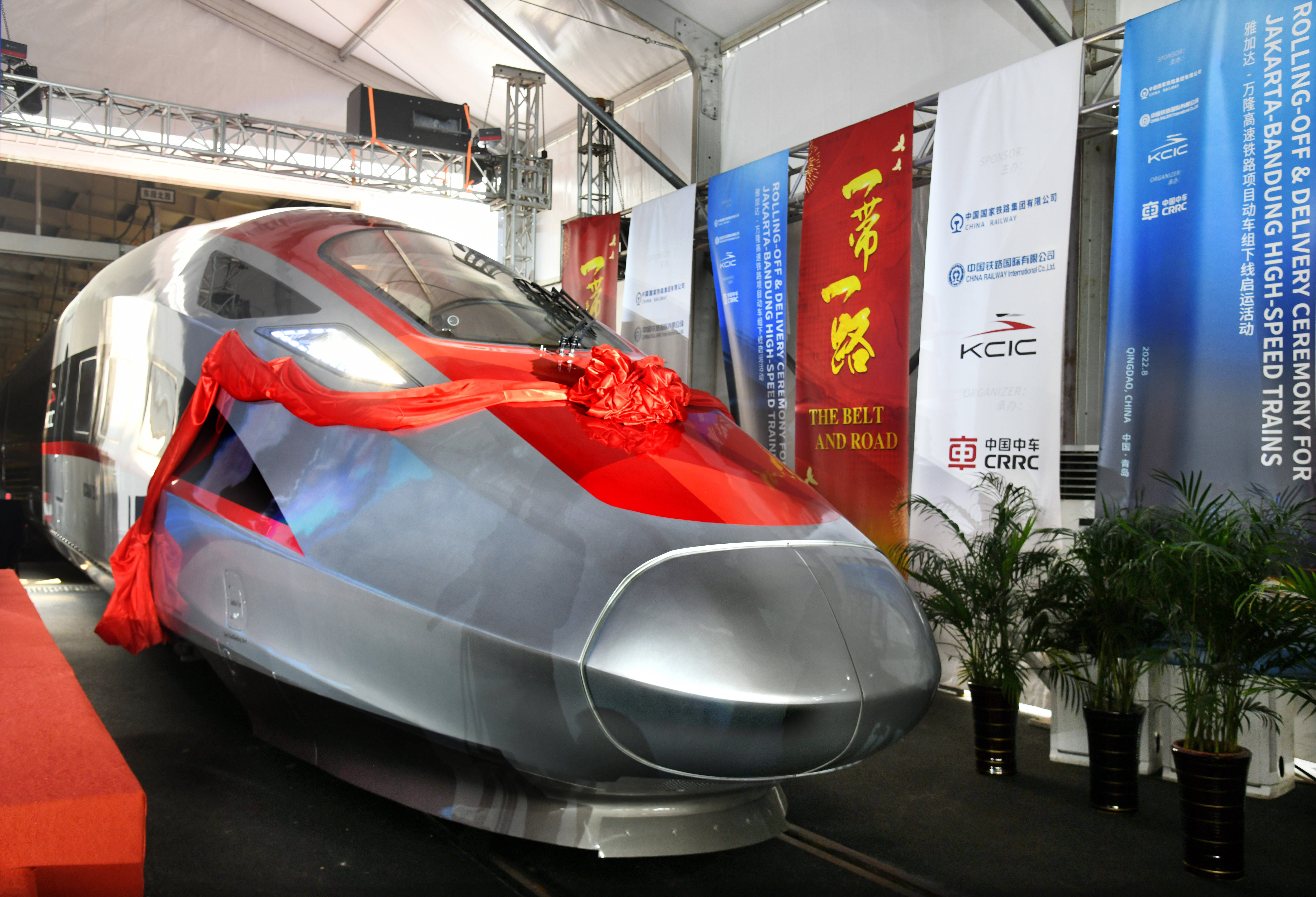 ▲2022年8月5日,在位于山东青岛的中车四方股份公司,一列雅万高铁高速动车组亮相动车组下线启运仪式现场。图/新华社