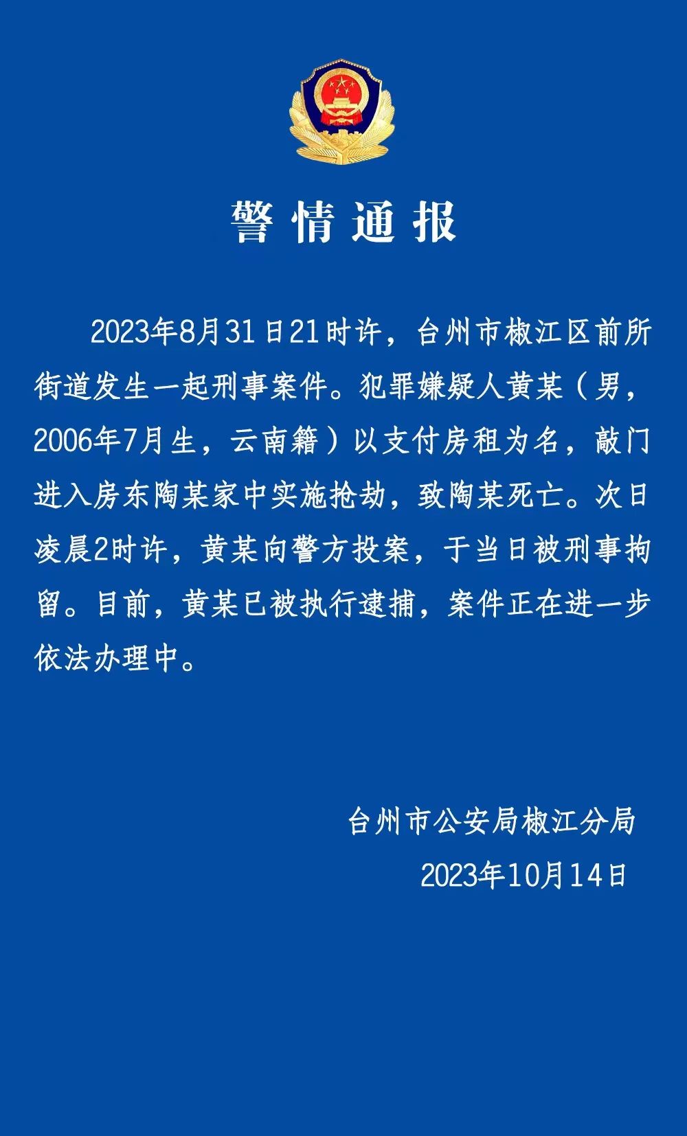 台州警方:一17岁男子以付房租为名入室抢劫杀害房东,已被逮捕
