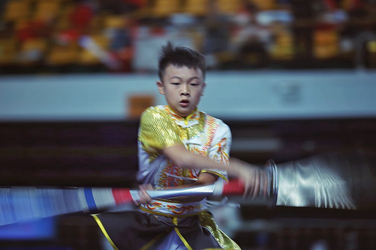 10月14日,广安体育馆,2023年西城区、门头沟区青少年武术赛上,一位参加“精武夺旗”比赛的男生在候场。