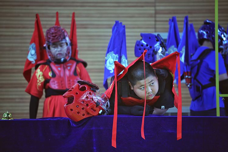 10月14日,广安体育馆,2023年西城区、门头沟区青少年武术赛上,两位男生参加创新体育赛事——精武夺旗。