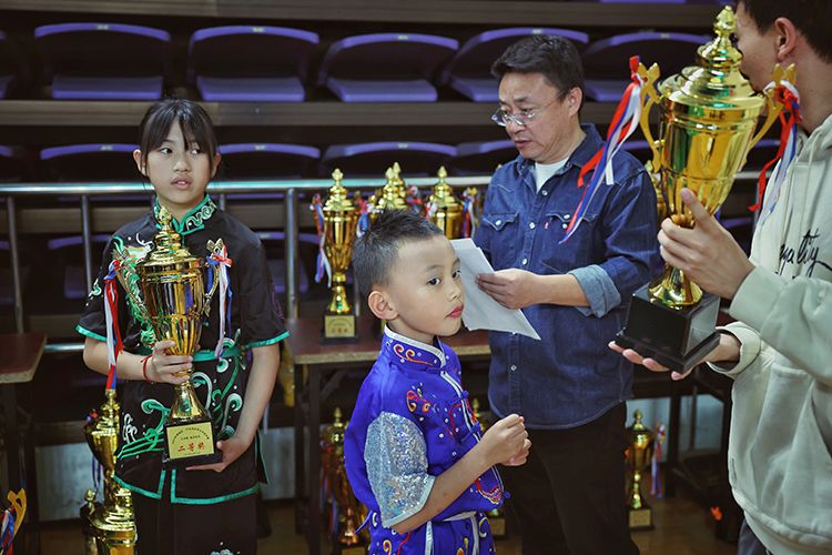 10月14日,广安体育馆,2023年西城区、门头沟区青少年武术赛上,获得集体项目奖项的学生领奖。