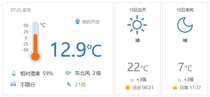 今天白天晴,北风三级左右(阵风五级)转一二级,最高气温23℃;夜间晴,北风一二级,最低气温7℃。
