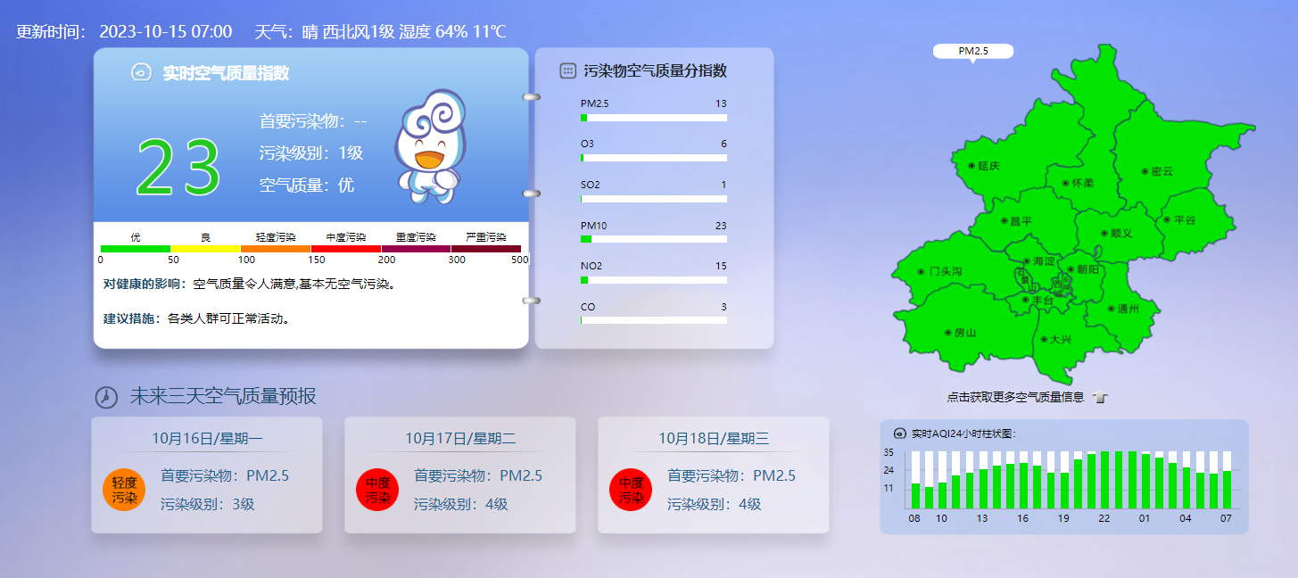 据北京市生态环境监测中心今早7时数据,目前实时空气质量指数23,空气质量优。
