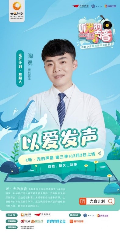 2021年,陶勇医生发起“光盲小主播”项目,希望整合配音演播艺术专家、盲人主播、音频平台、公益机构等力量,开发一套面向视障青少年的播音主持课程,让小学员们在实践中培养兴趣,不但能从音频的世界里汲取更多知识和营养,更能登上声音世界里的大舞台,成为优质音频内容的创作者和制作者,拥有更多元的未来。