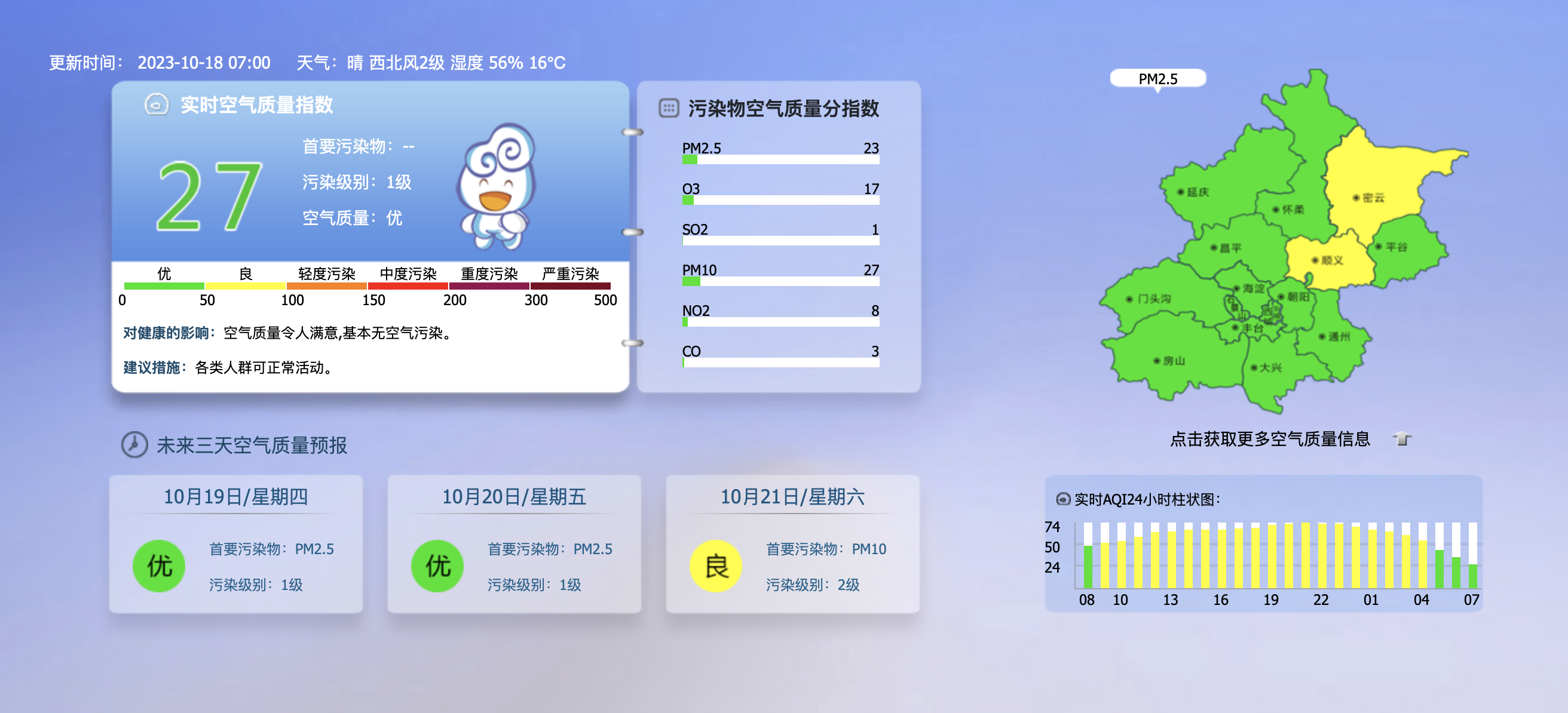 据北京市生态环境监测中心今早7时数据,目前实时空气质量指数27,污染级别1级,空气质量优。