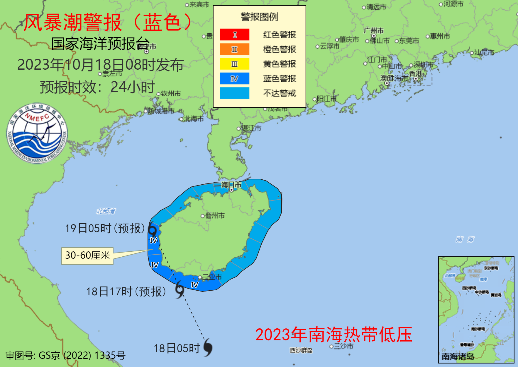 风暴潮方面,预计10月18日下午至19日上午,海南岛沿海将出现30厘米到60厘米的风暴增水。海南省三亚市、乐东县和东方市的风暴潮预警级别为蓝色。