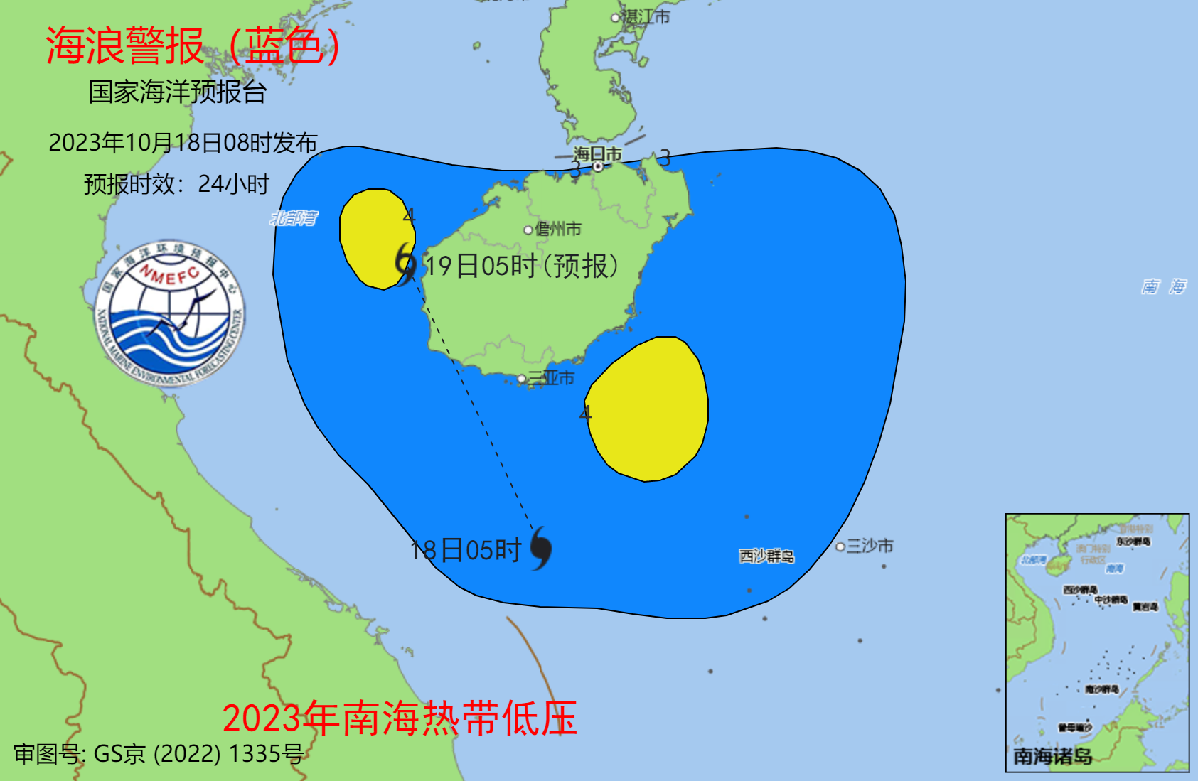 海浪方面,受南海热带低压和冷空气的共同影响,预计10月18日中午到19日中午,南海西部、北部湾将出现3米到4.5米的大浪到巨浪区;海南近岸海域将出现2米到3.4米的中浪到大浪,近岸海域海浪预警级别为蓝色。