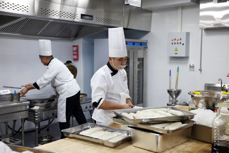 厨师制作糕点。西三旗街道养老助餐中央厨房内冷冻库、冷藏库、主食加工间、副食加工间内设备完善。