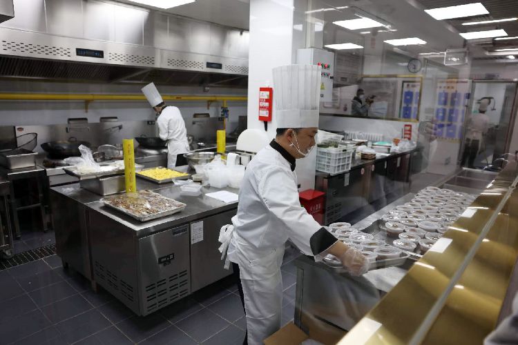 厨师将餐食装盘。在前期的调研中,14个社区1000余名老年人的调查样本显示,有将近90%的老人家庭有养老助餐需求。