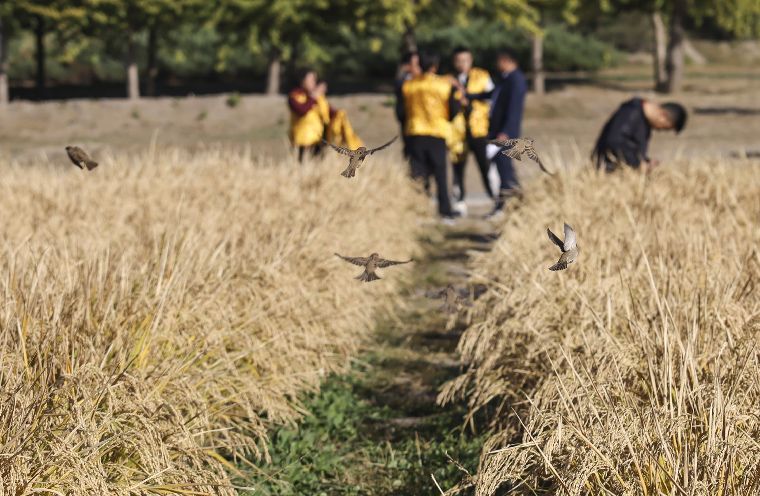 一群麻雀在稻田里品尝稻米。“多稼如云”是圆明园四十景之一,初名“观稼轩”,是圆明园中最能体现农耕文化的景群,盛时这里殿宇前后溪河环绕,荷塘、稻田密布,呈现出江南水乡的田园风光。