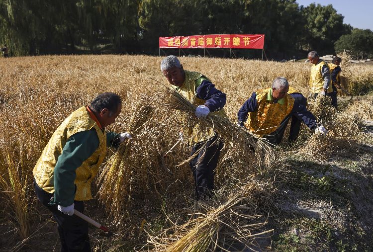 圆明园首届御稻开镰节启动,工作人员收割水稻。