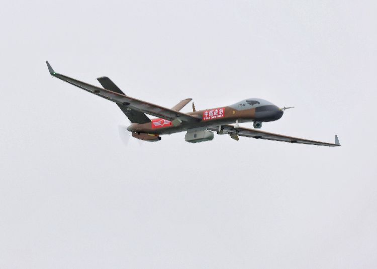 10月27日9时,湖北荆门,演练现场模拟火情,滚滚浓烟传出。“翼龙”-1E第一时间发现火情并报告救援指挥部,救援指挥部立即研判、迅速决策。图为翼龙”-1E无人机进行了空中巡护、火情监测和应急通信。
