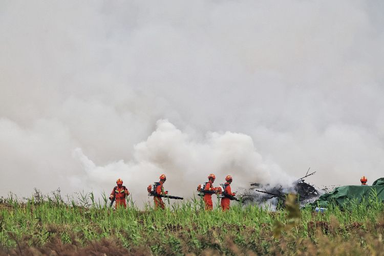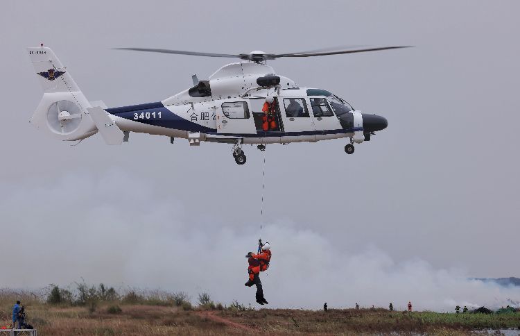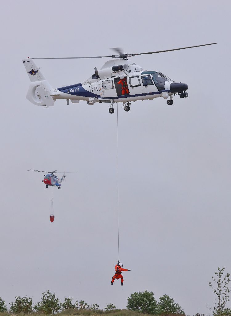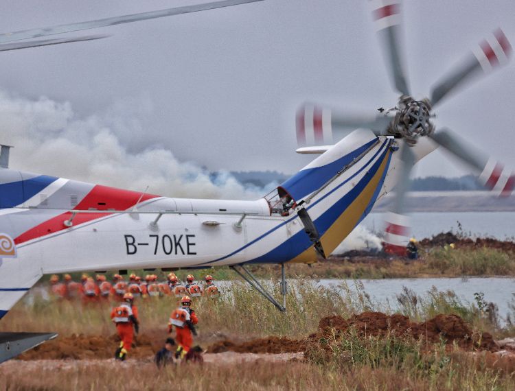 AC313直升机吊桶取水灭火。实战演练中,AG600M灭火机、“新舟”60灭火机、AC313消防直升机共执行8架次投水灭火任务,累计投水70吨,实现预期灭火效果。
