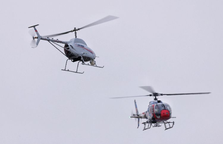 AR-500无人直升机(左)进行灾后空中监测,确认余火已被完全扑灭。