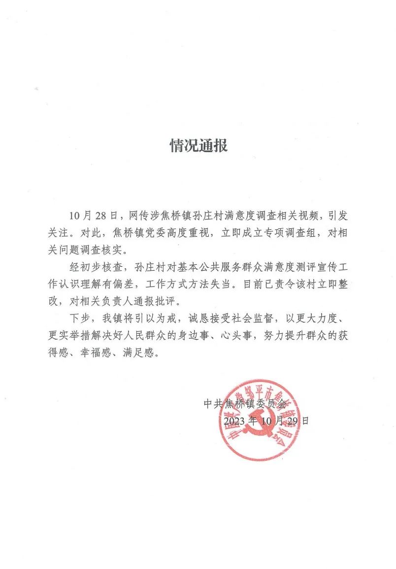 新京报讯 10月29日,山东邹平焦桥镇就网传孙庄村满意度调查相关视频发布情况通报,通报称已责令该村立即整改,对相关负责人通报批评。