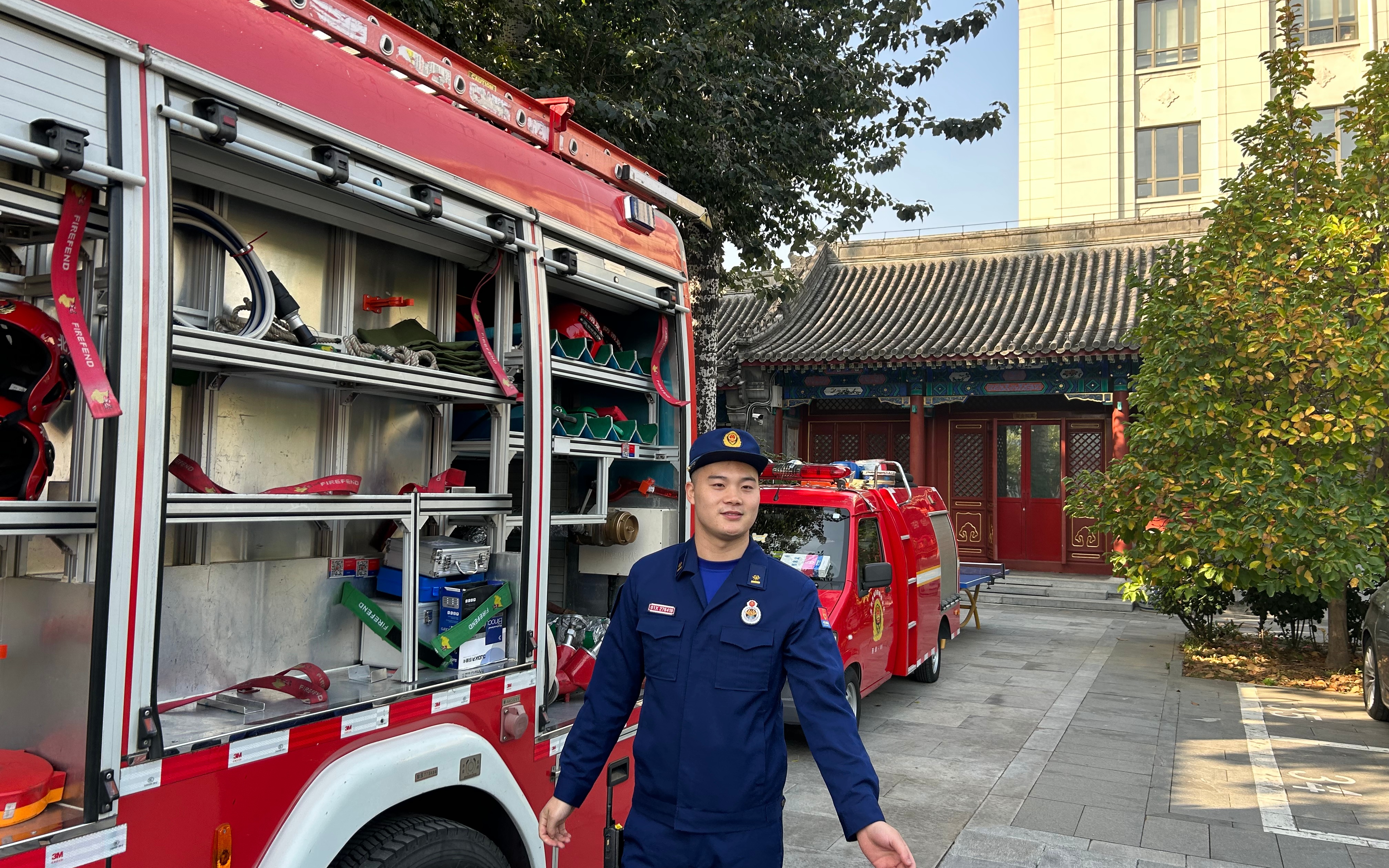 消防员介绍消防车。 新京报记者 彭镜陶 摄