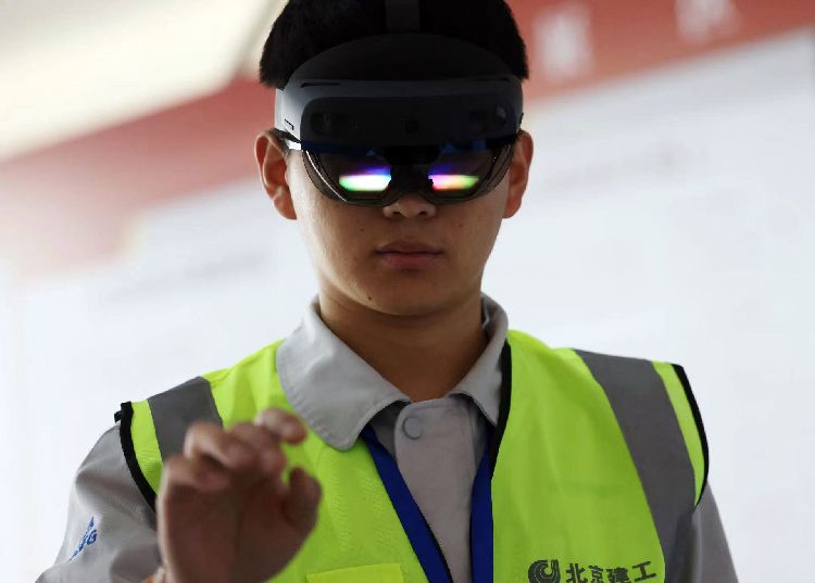 北京轨道交通13号线扩能提升工程04标项目是目前北京轨道交通在施车站最大的项目,着眼于打造北京轨道交通智慧工地示范线,项目团队采用AI、5G、BIM、云计算、大数据等技术,以轨道交通智慧工地中心为中枢,打造“最强大脑”对项目现场进行统筹管理,形成了“一个综控室、两个模块、三个平台”的智慧化管理构架,实现全过程信息化管理,提升监管效能,减少现场管理成本。图为工作人员展示MR眼镜。