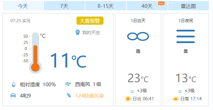 今天早晨有雾,白天晴间多云,有中度霾,北转南风二三级,最高气温23℃;夜间晴转多云,有轻雾或雾,南转北风一二级,最低气温13℃。