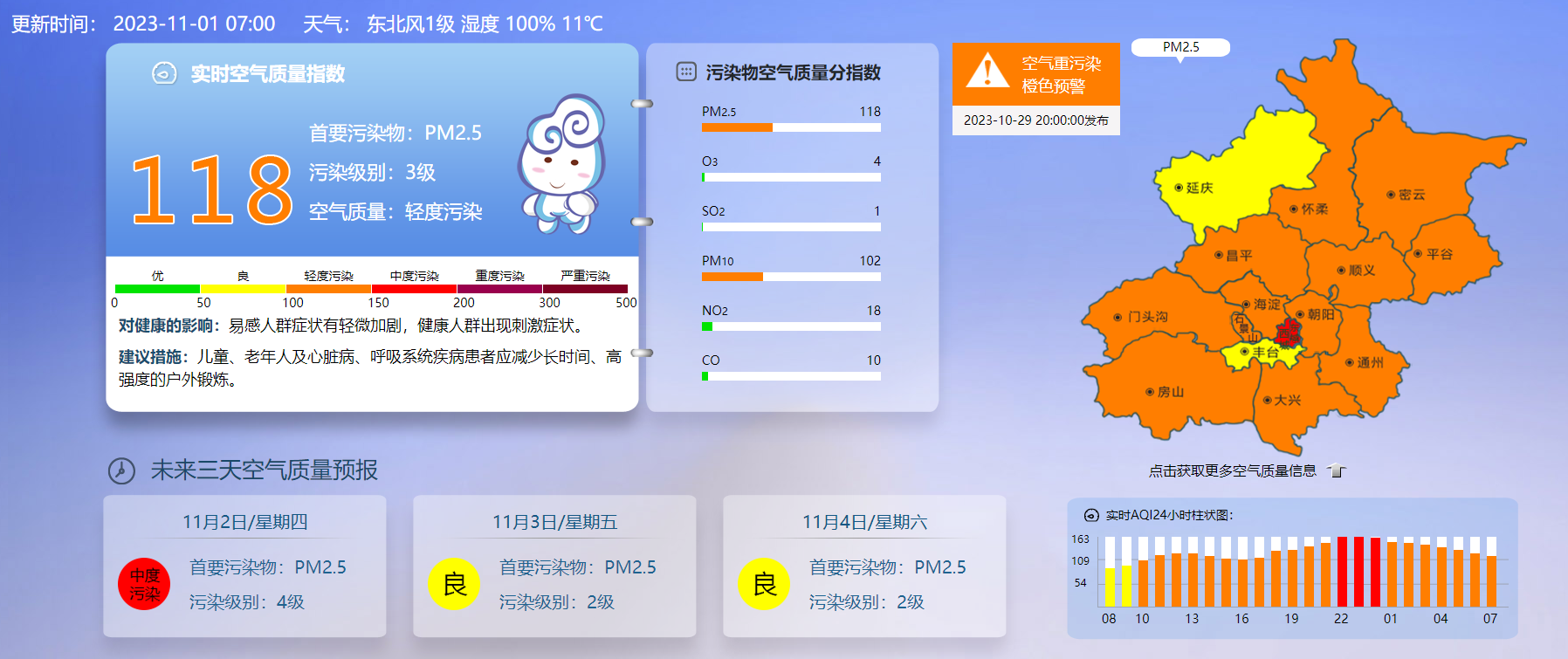 据北京市生态环境监测中心今早7时数据,目前实时空气质量指数118,首要污染物PM2.5,污染级别3级,空气质量轻度污染。
