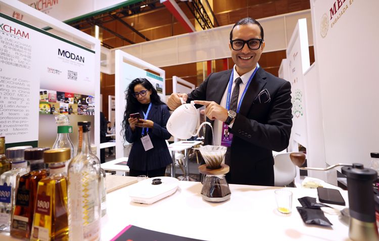 中国墨西哥商会展台,工作人员制作墨西哥咖啡。