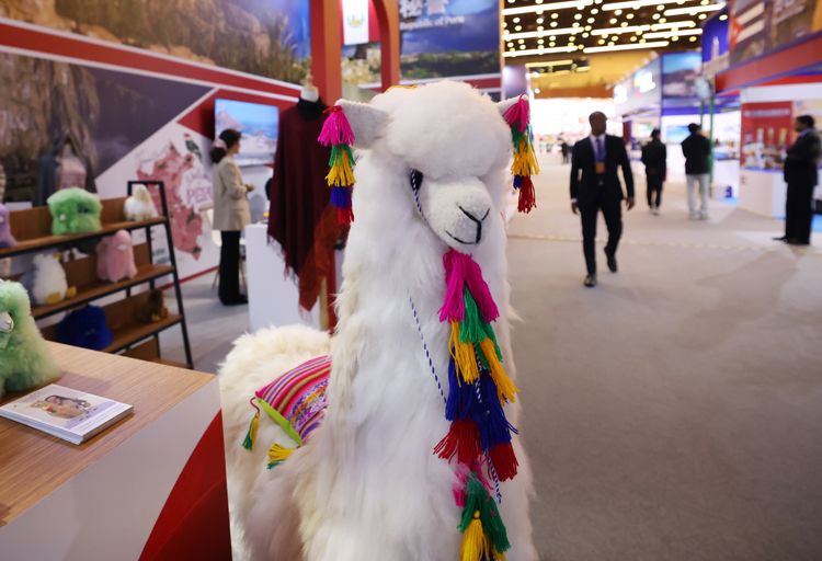 秘鲁展台上的羊驼毛绒玩具。
