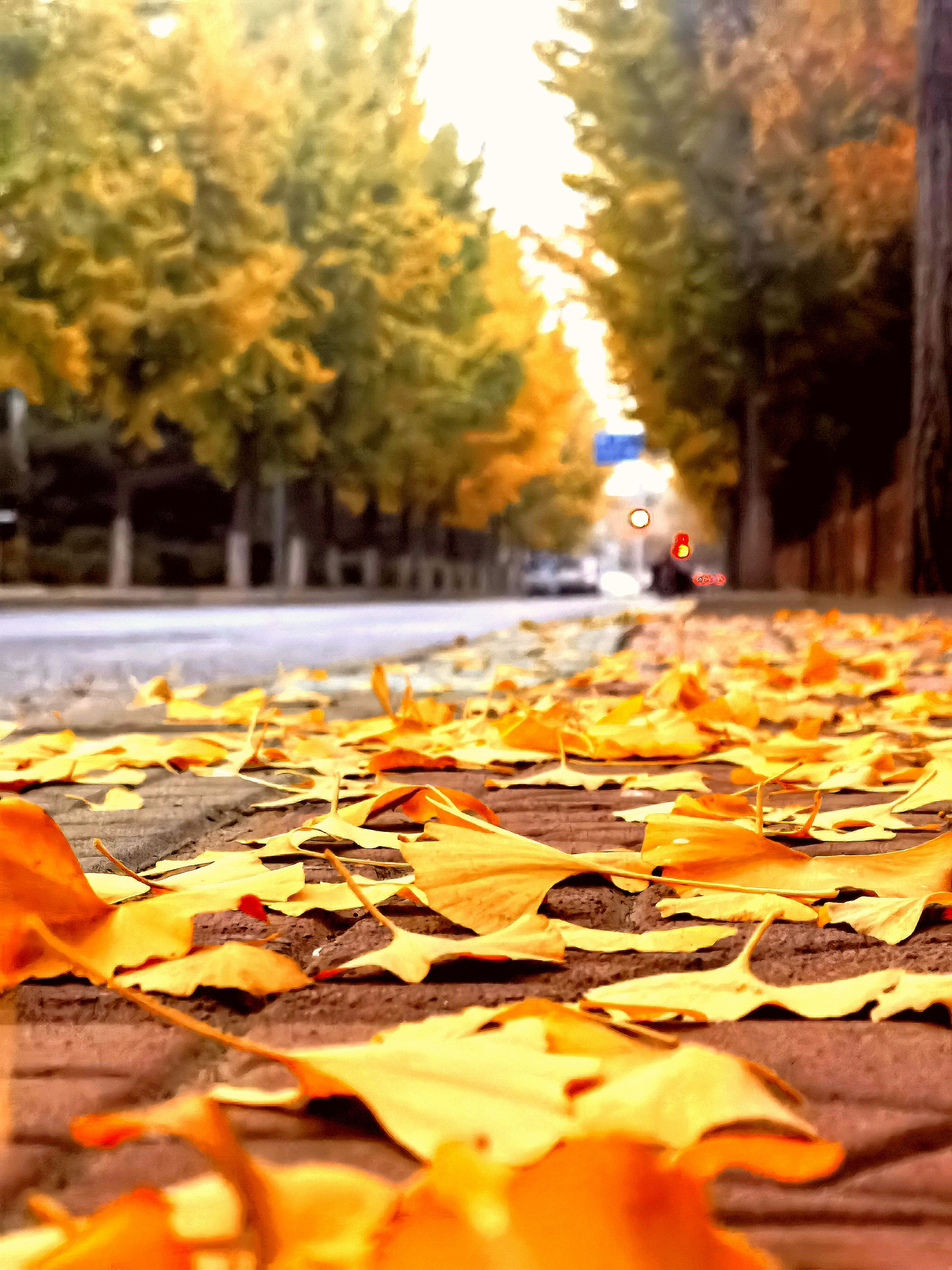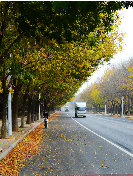 在南宫路,梧桐树翠色渐黄,人行步道边落叶堆积成金色小径,平铺一路秋色。路过的市民王先生说:“这些落叶走上去‘咔嚓咔嚓’的,满地金黄,有种浪漫的气息。”
