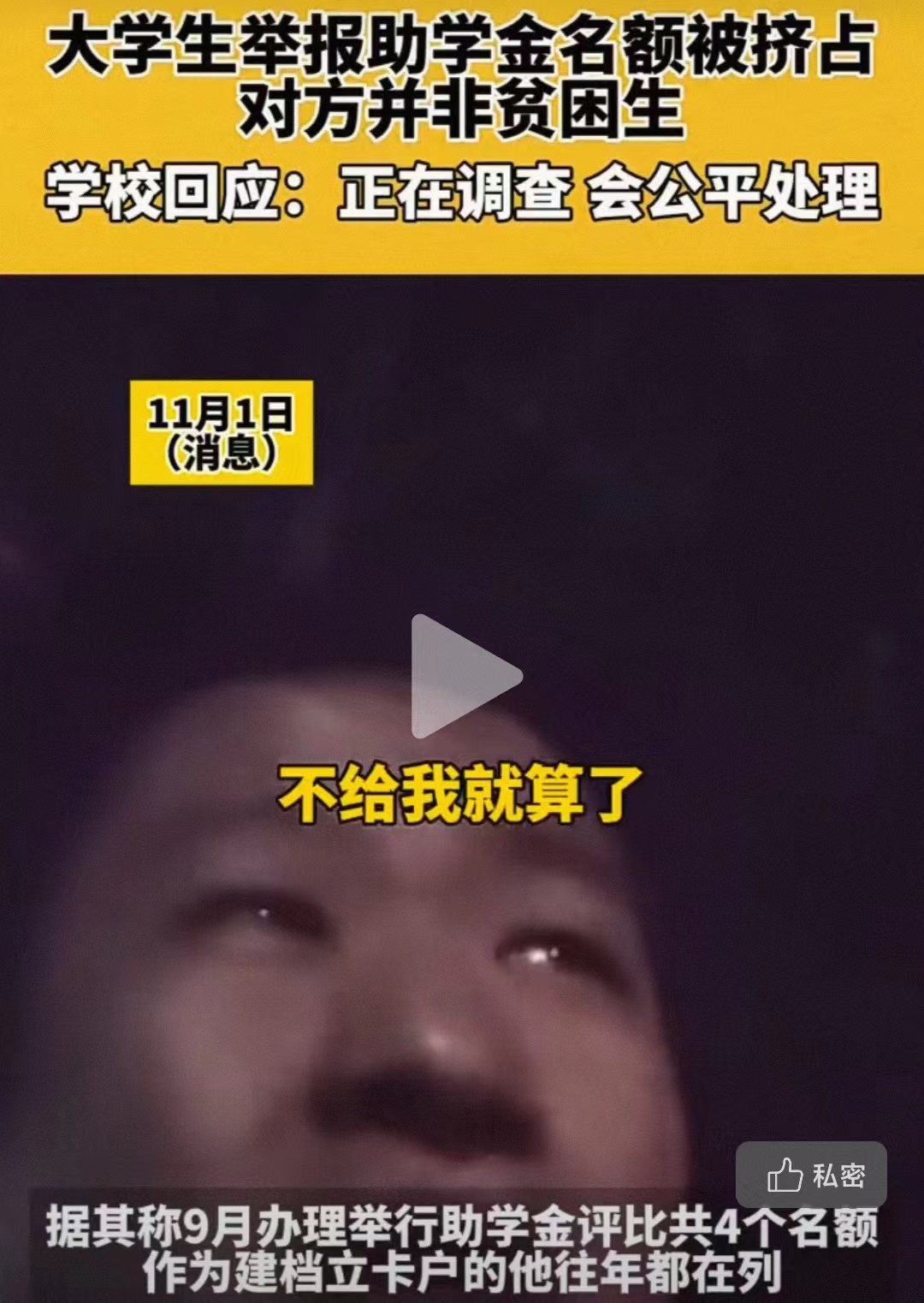 ▲“贫困生举报助学金名额被挤”一事引发关注。图/网络视频截图