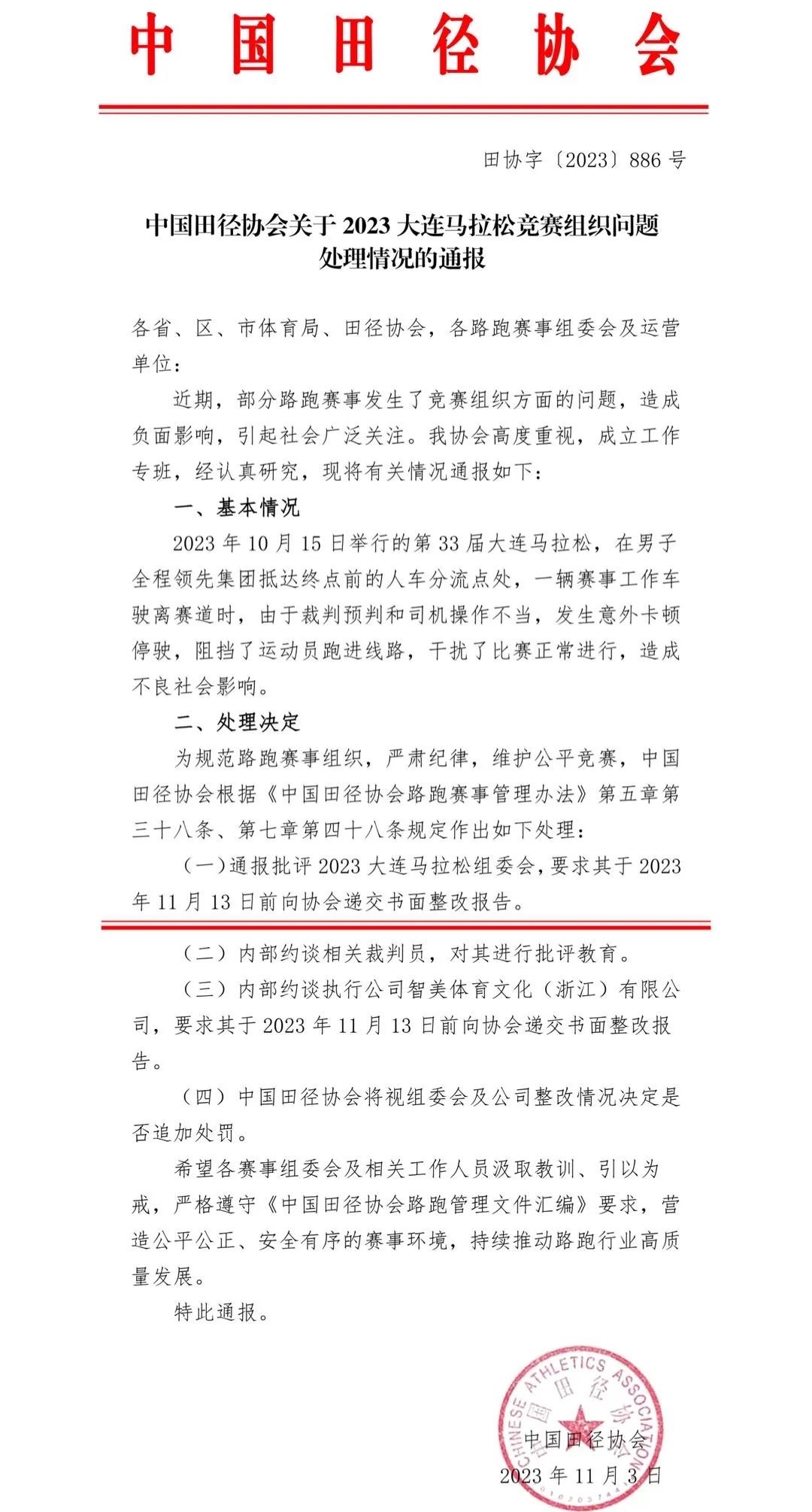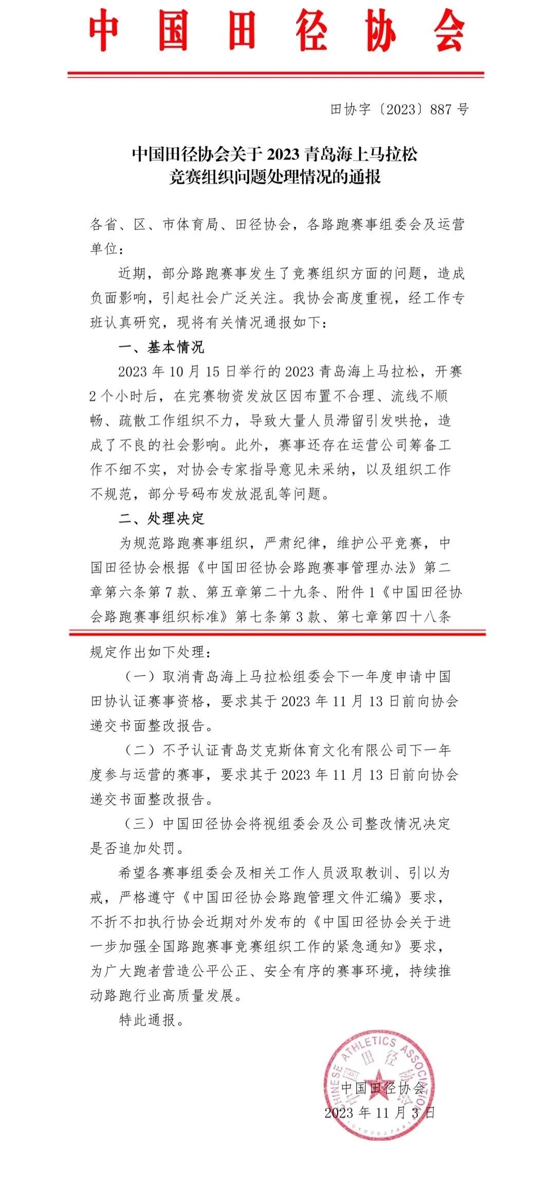 新京报讯 11月3日晚,中国田径协会发布了《关于近期路跑赛事竞赛组织问题处理情况的通报》,对近期出现竞赛组织问题的大连马拉松、青岛海上马拉松的相关单位和人员进行处理。具体情况通报如下: