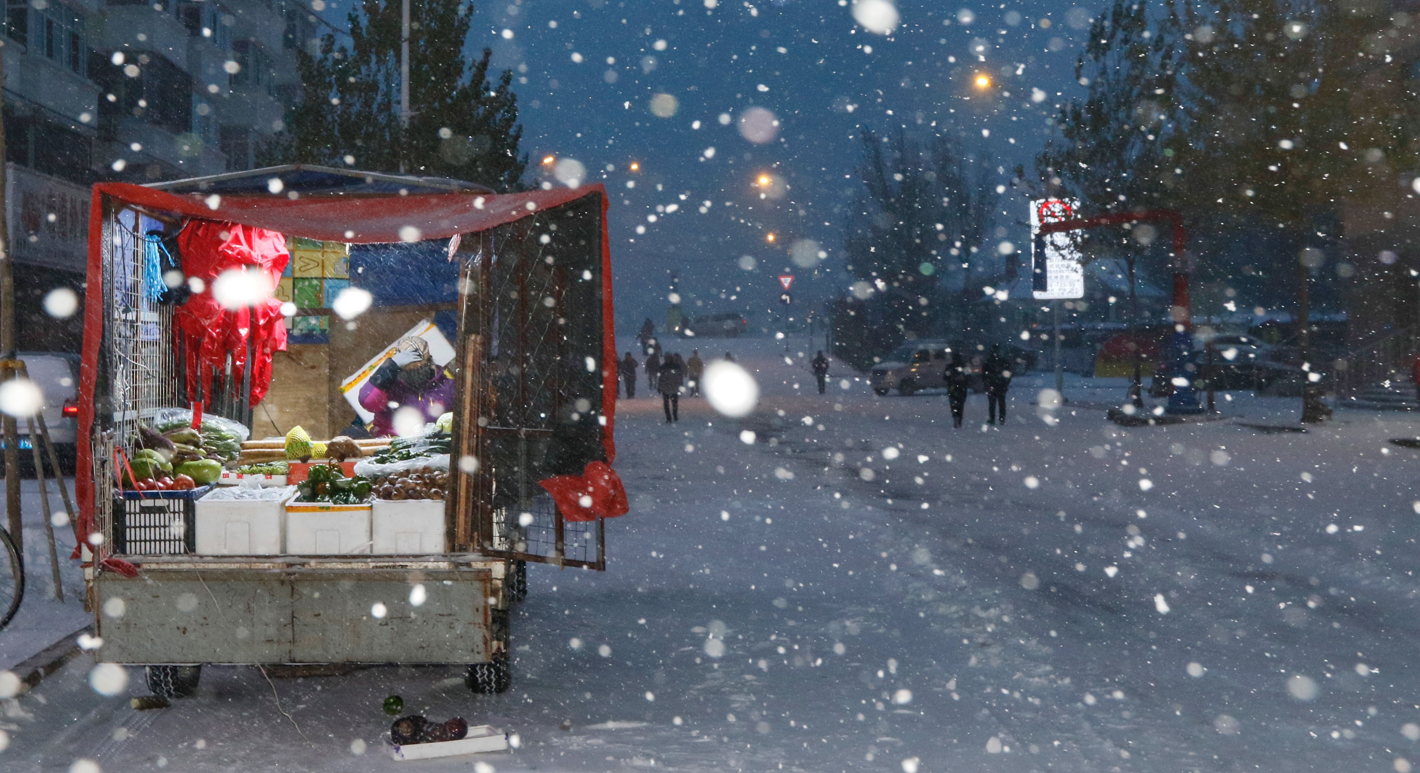 11月6日,黑龙江省哈尔滨市,清晨,街边的摊贩冒雪出摊。