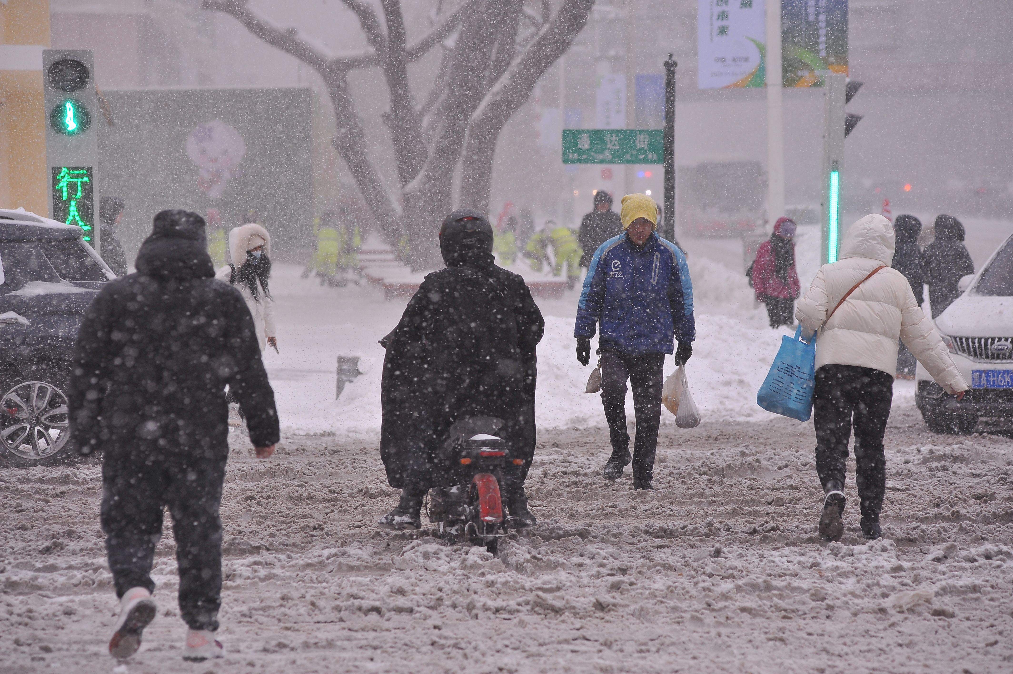 11月6日,黑龙江省哈尔滨市,雪中,行人小心翼翼过马路。