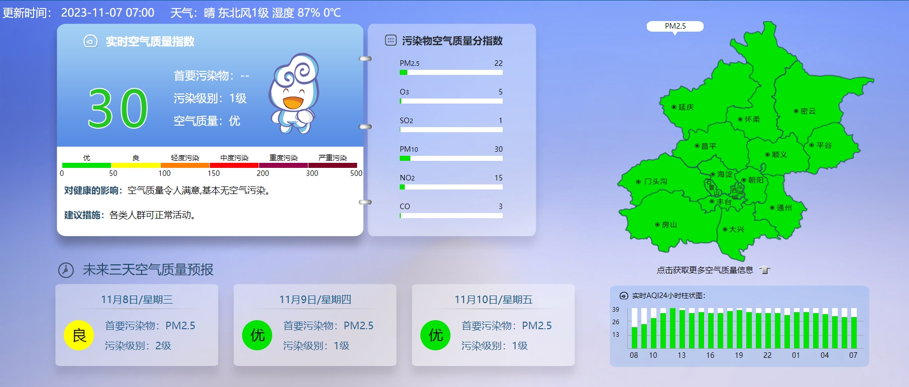 据北京市生态环境监测中心今早7时数据,目前实时空气质量指数30,空气质量优。