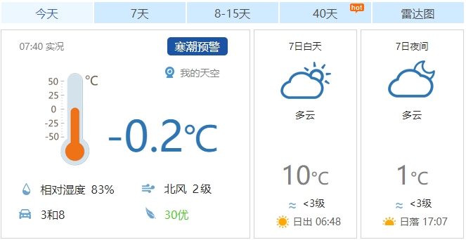 今日限行尾号为3和8。未来三天晴到多云为主,气温较低,寒潮蓝色预警中,出行注意防寒保暖,谨防感冒和心脑血管疾病。