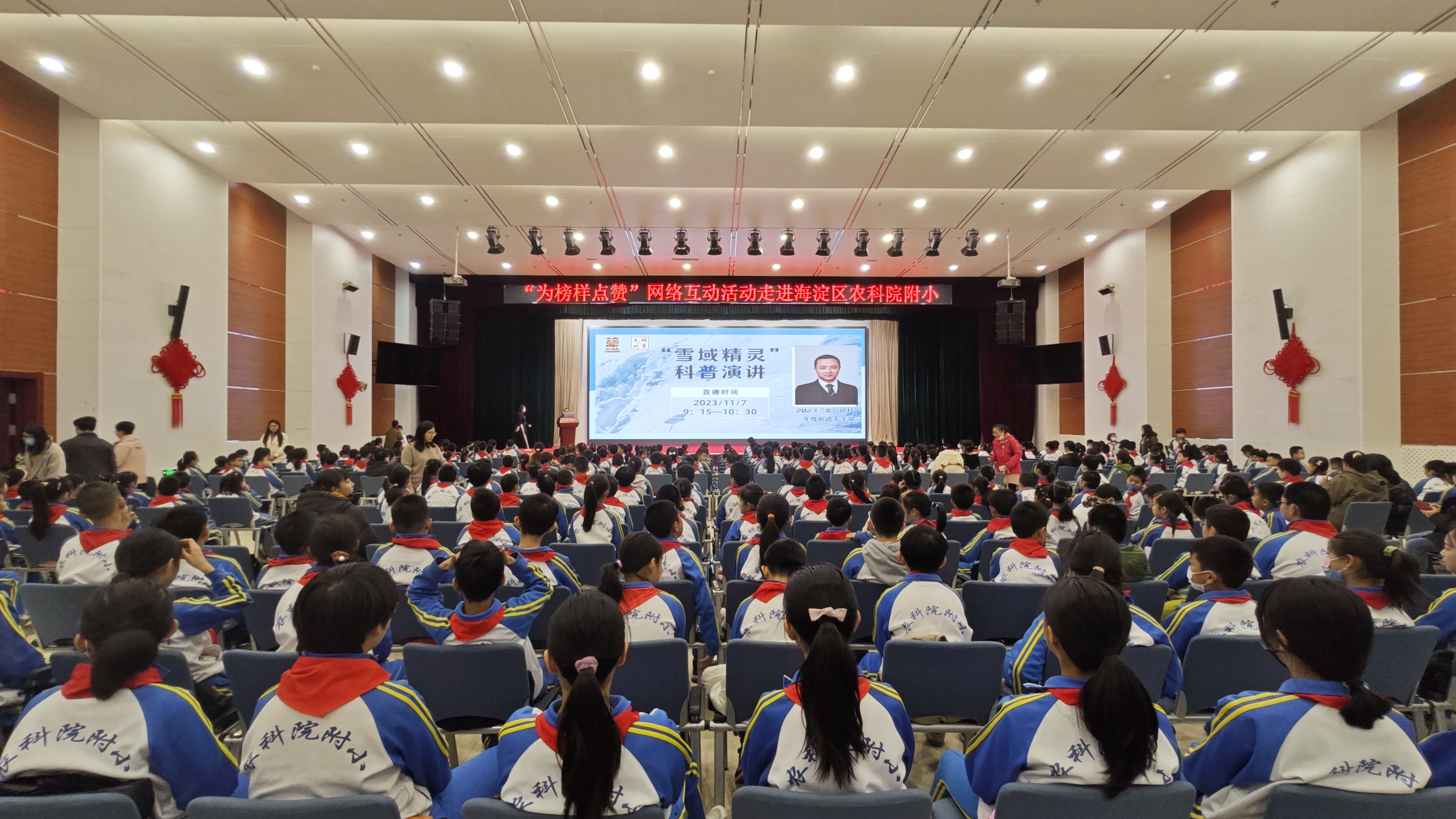 新京报讯(记者耿子叶)11月7日,“为榜样点赞”网络互动系列活动,走进中国农业科学院附属小学。活动现场,2023年度榜样候选人、中国科学院植物研究所研究员王强,通过线下演讲和线上直播的形式,为海淀区10万余名中小学生带来了一堂科普演讲《雪域精灵》。今年的“为榜样点赞”网络互动,于11月1日持续至11月20日,“2023北京榜样”共评审产生67组榜样人物进入年度评选。