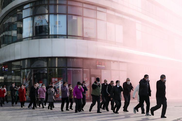 9时20分,区域联防灭火救援演练开始。演练假想望京SOHO塔三5层办公区因电气线路故障,引燃附近可燃物,并迅速蔓延至办公区西北角,群众从楼内疏散。