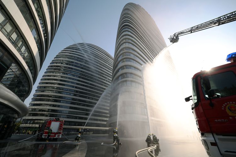 北京朝阳区消防宣传月启动,望京SOHO灭火救援演练