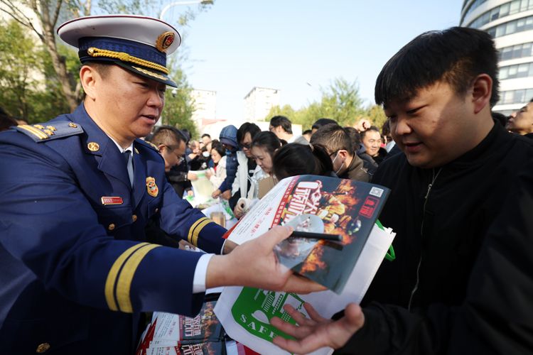 现场向市民发放防火宣传材料。