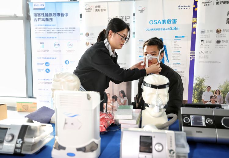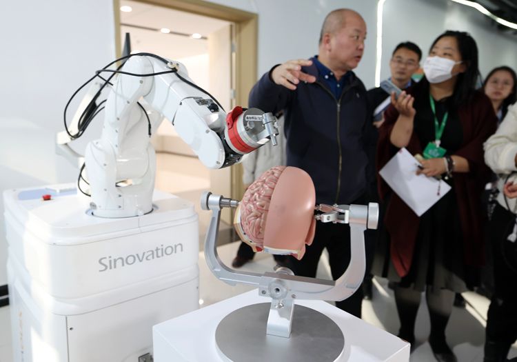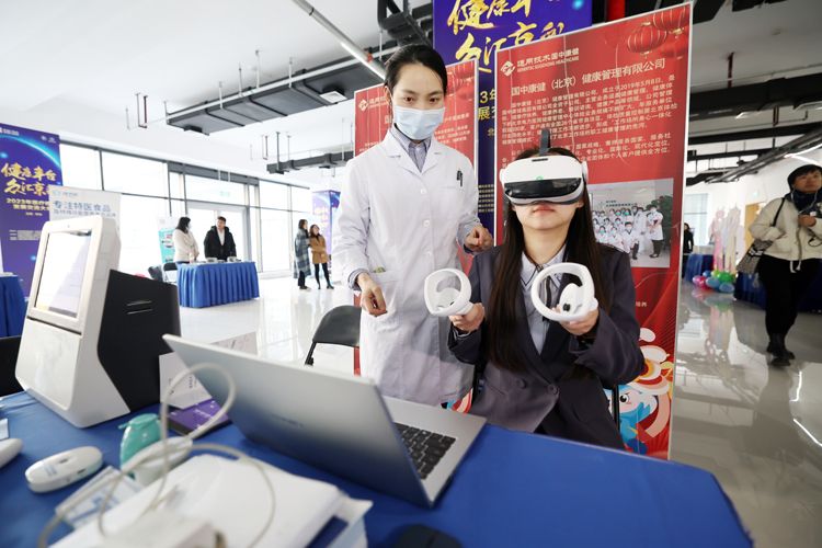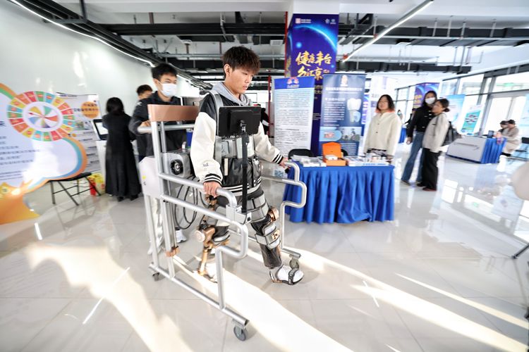 在大会主题展览上,来自北京医准医疗科技有限公司、国药控股北京天星普信生物医药有限公司、上药医疗器械(北京)有限公司等20多家企业展示了医疗健康领域的最新科研成果和产品。图为运动功能训练机器人。