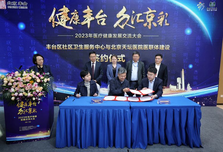 11月8日,“健康丰台 众汇京彩”2023年医疗健康发展交流大会在新村街道樊家村鼎业健康产业园举行。会上,北京天坛医院、北京口腔医院、北京市丰台中西医结合医院等医疗机构分享科研和医疗产业转化成果,国药控股、首科医谷、北京中成康华科技发展股份有限公司等企业介绍了智慧医疗、未来健康产业的发展情况。图为北京天坛医院与丰台区15家社区卫生服务机构组建医疗联合体并签订合作协议。