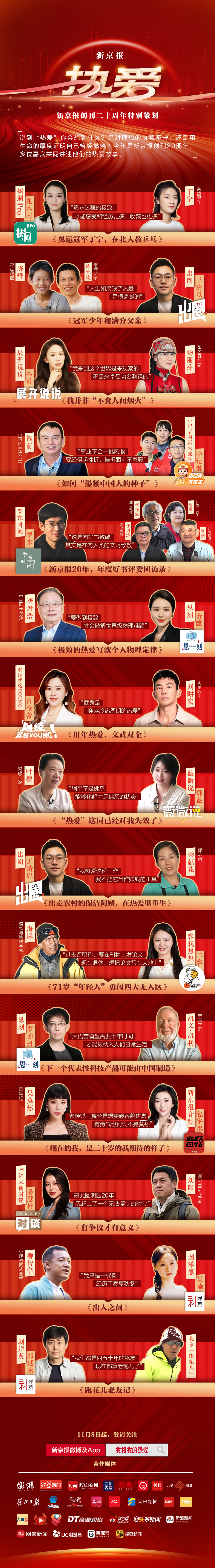 说到“热爱”你会想到什么?是对理想的执着坚守,还是用生命的厚度证明自己曾经燃烧?今年是新京报创刊20周年,我们邀请了奥运冠军丁宁、亚运会滑板碗池冠军陈烨、杨丽萍、刘畊宏、院士钱前、何怀宏、任剑涛、财经作家叶檀、“未来学家”凯文·凯利等,共同讲述他们的热爱故事。