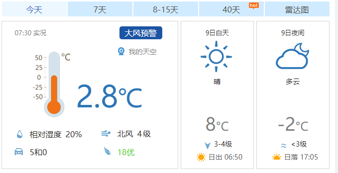 今天早晨至白天晴,北风四级左右,阵风七级左右,最高气温8℃;夜间晴转多云,北风三四级转二级,最低气温零下2℃。