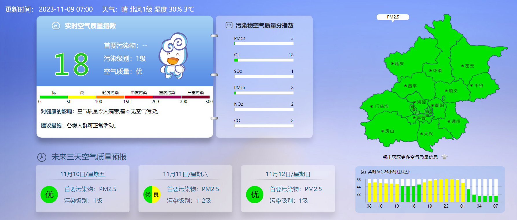 据北京市生态环境监测中心今早7时数据,目前实时空气质量指数18,空气质量优。