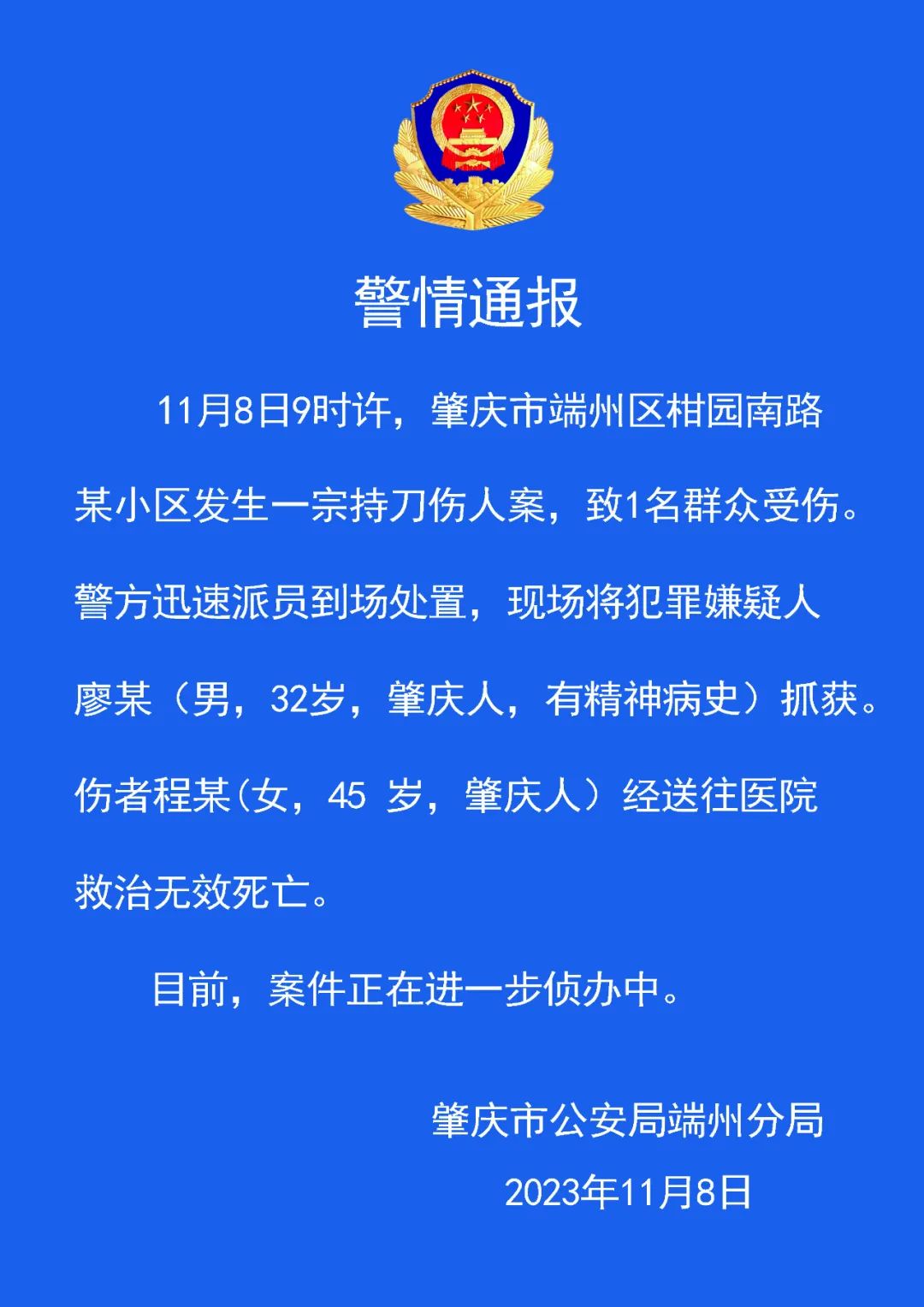 广东肇庆一男子持刀伤人致死 警方:该男子有精神病史,已被抓获