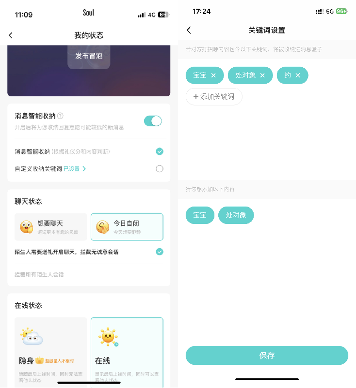 Soul还推出了“消息盒子”功能。当用户开启智能收纳时,可以自定义选择不希望收到的消息关键词,带有此类关键词的消息将一并折叠放至消息盒子。此外,若用户遇到攻击辱骂、低俗色情骚扰等情况,Soul将开启“今日自闭”提醒。目前,“今日自闭”状态下的默认时长已增加至72小时。