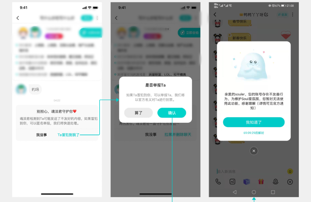 在治理方面,Soul推出了“魂淡君守护弹框”功能,通过系统询问接收信息的用户是否觉得被冒犯,来判断是否要对该发送骚扰信息的用户进行禁言。用户还可以在私聊场景中自主选择对进行不文明发言的人进行举报,违规者将被限制使用私聊功能并扣除一部分社交礼仪分。