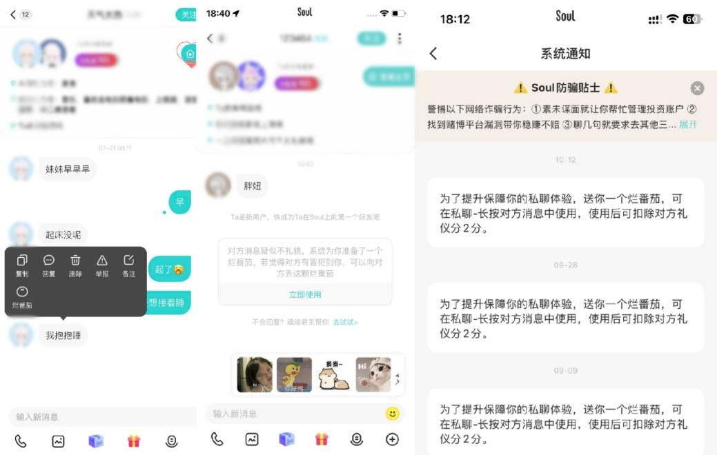 此前,Soul上线“烂番茄”功能,用户可以自定义私信对话拦截关键词,并对不礼貌发言使用“烂番茄”,扣除对方礼仪分。在本季度,Soul针对该功能进行了进一步升级,系统会在用户满足使用规则时,主动发送提醒,引导其规范使用。