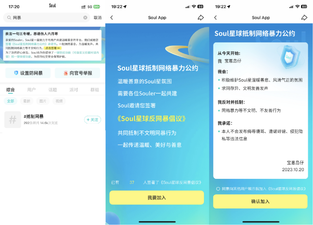 本季度,Soul上线了防网暴专项,邀请用户签署防网暴协议。当用户搜索“网暴”时,文明礼貌引导发言会置顶呈现,邀请其加入《Soul星抵制网络暴力公约》,同时也指引其更快速地向官方举报,或使用今日自闭及消息收纳功能来更好地保护自身的权益及安全。