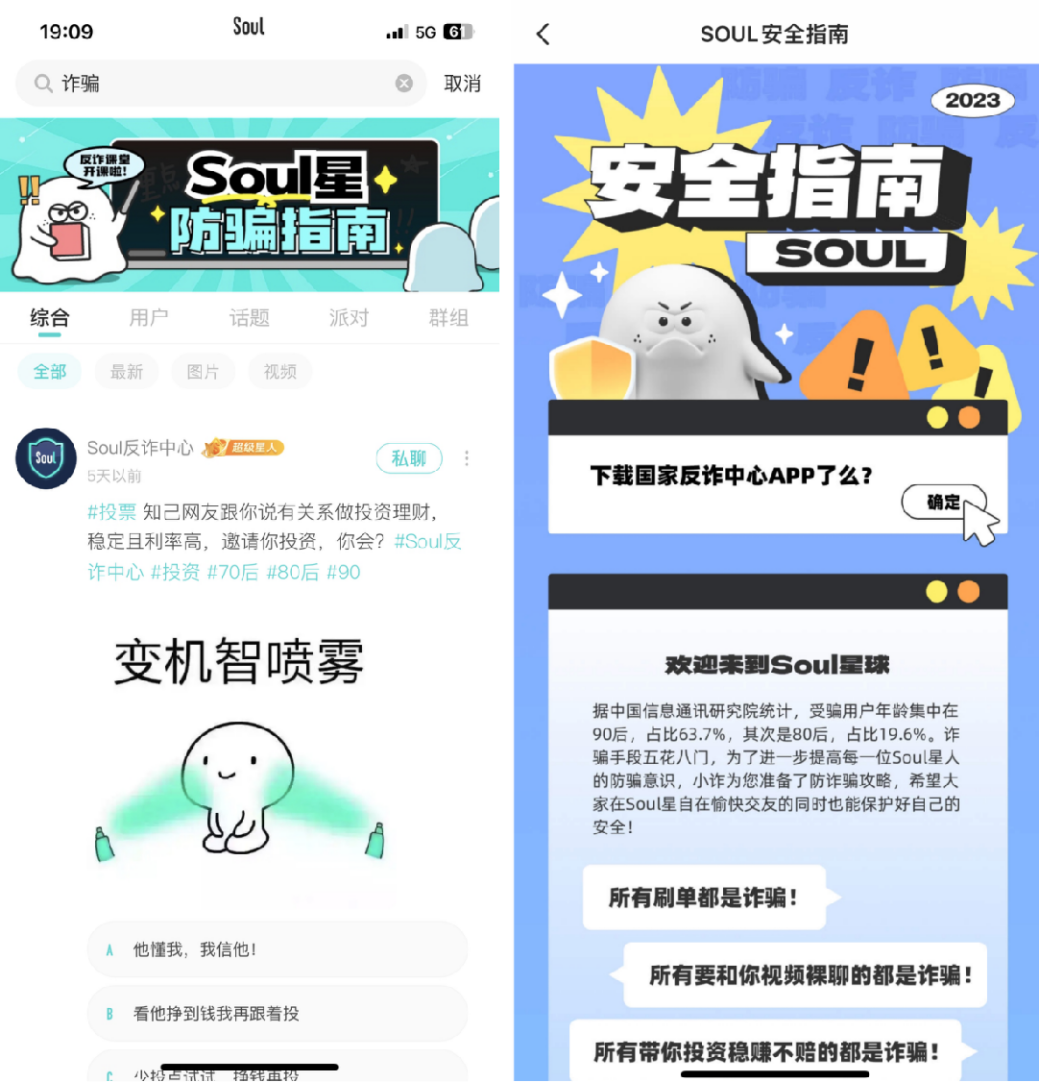 一直以来,Soul都不具备转账功能。针对不法分子将用户吸引至第三方平台的导流诈骗行为,Soul会对含有导流意向的消息进行风险提示,并对部分高风险对话框进行锁定,接收方通过防诈骗知识答题才能解锁。在本季度,反诈骗题库进行了新一轮的更新。