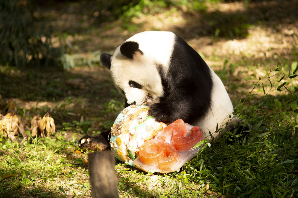 8月27日,迎来26岁生日的大熊猫“添添”在美国首都华盛顿史密森学会国家动物园享用生日蛋糕。新华社发(温斯特德·巴恩斯 摄)