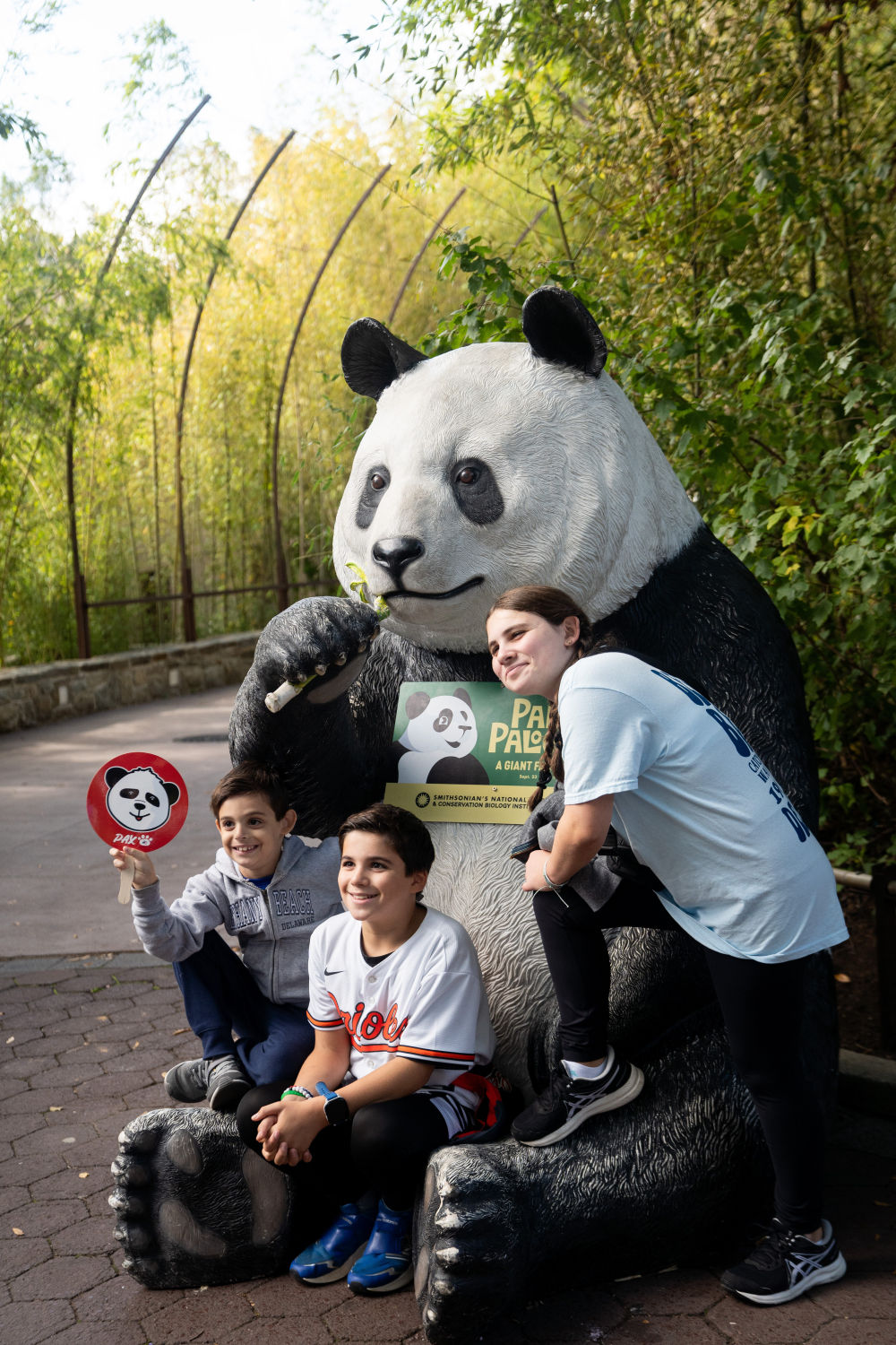 9月30日,在美国华盛顿史密森学会国家动物园,游客与大熊猫雕塑合影。新华社记者刘杰摄